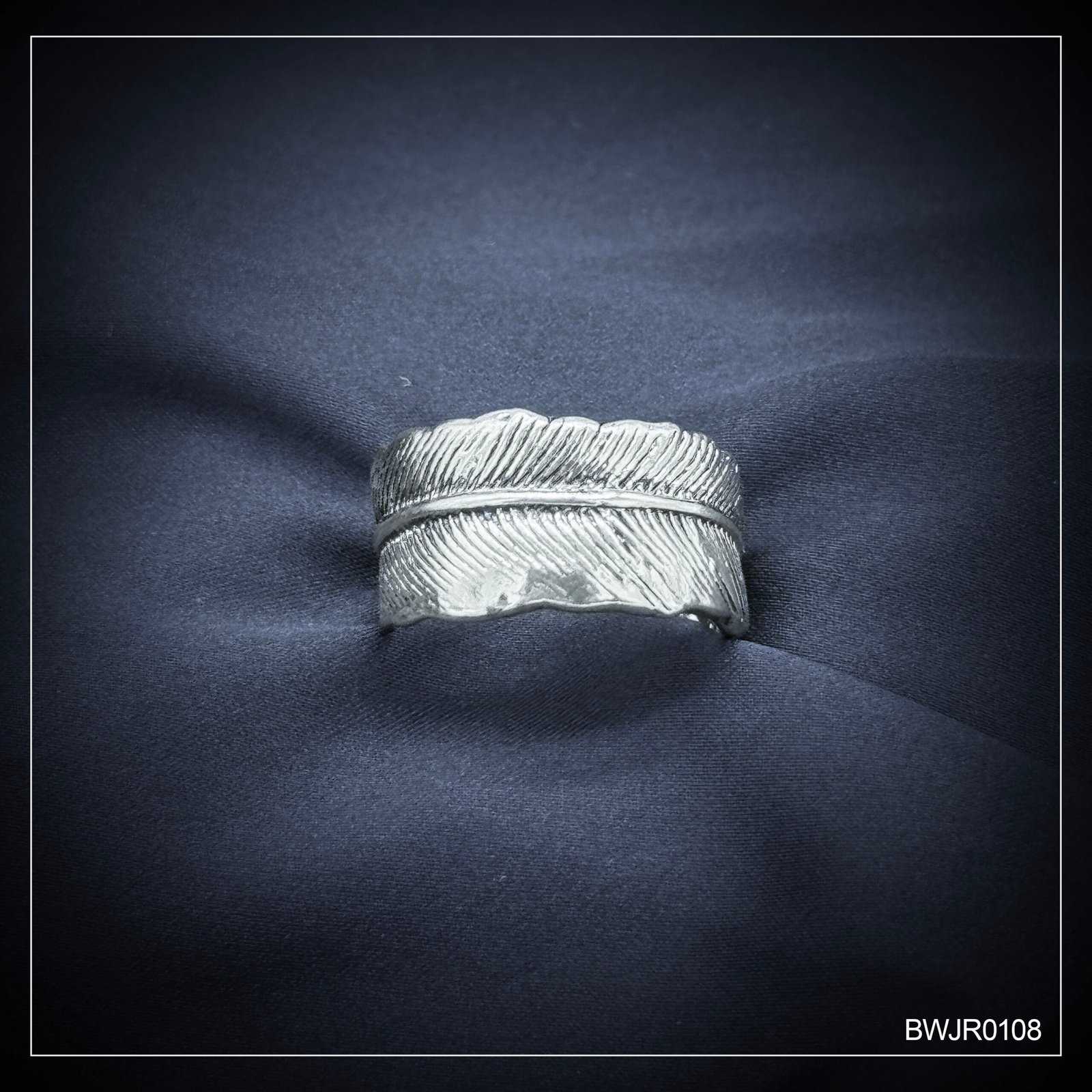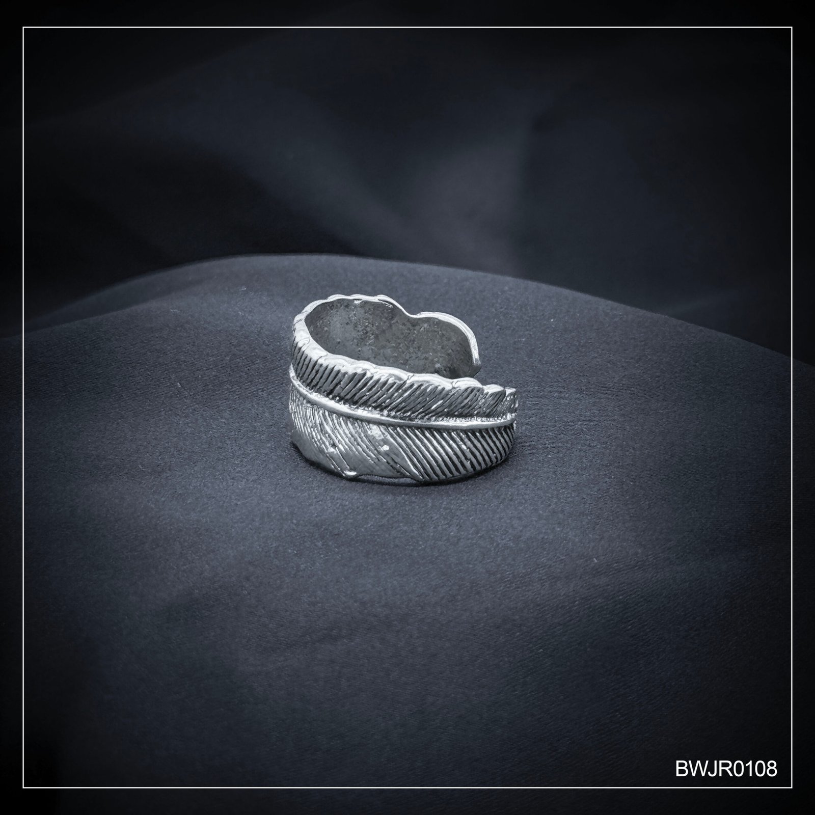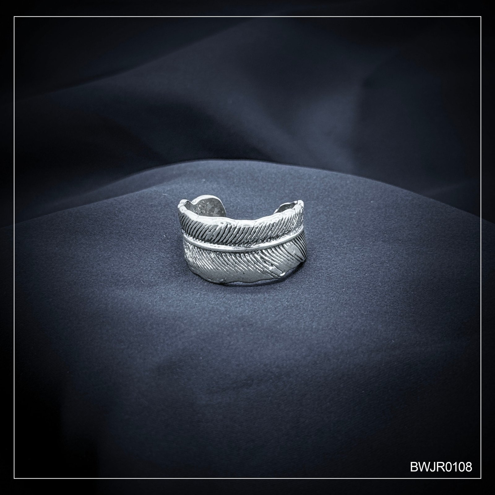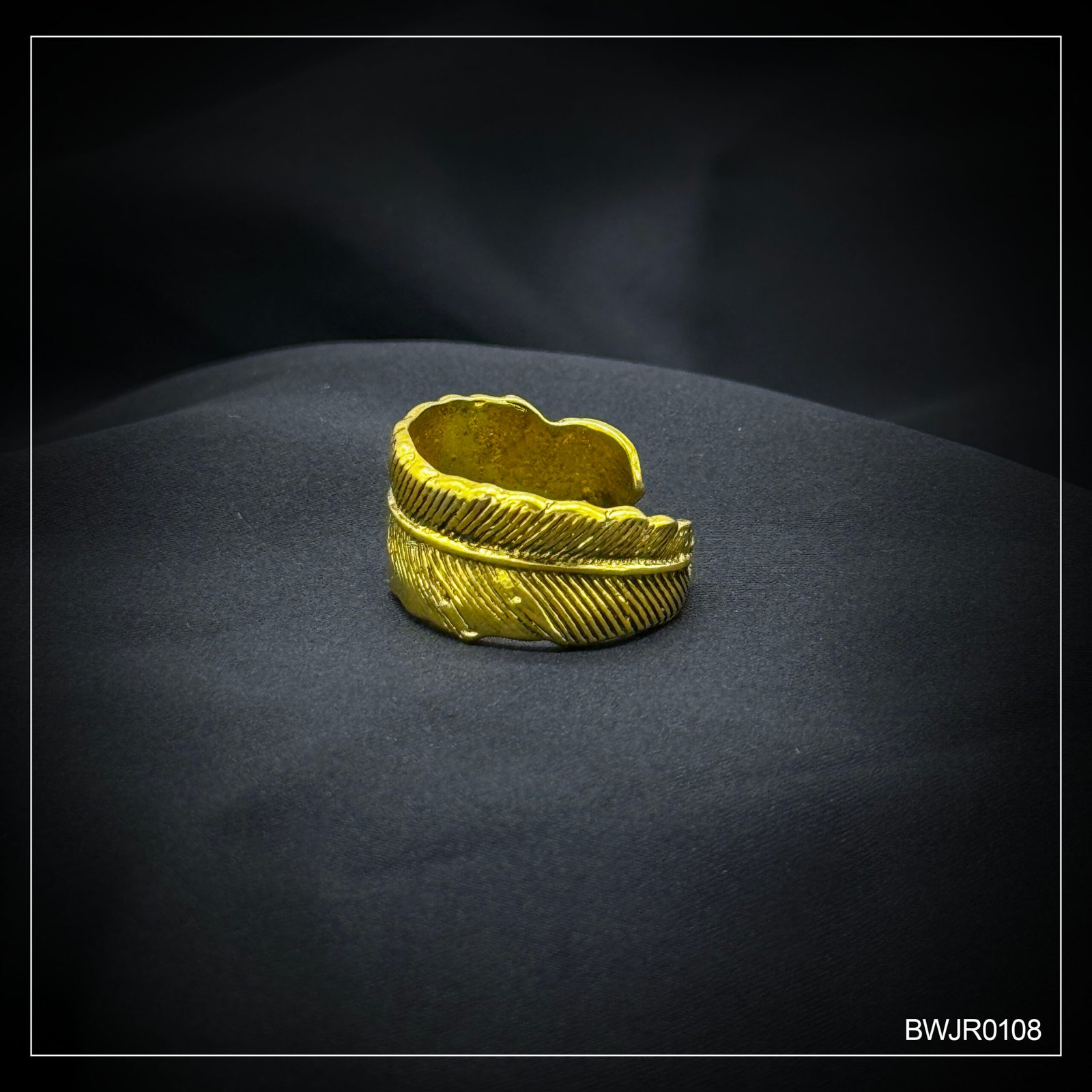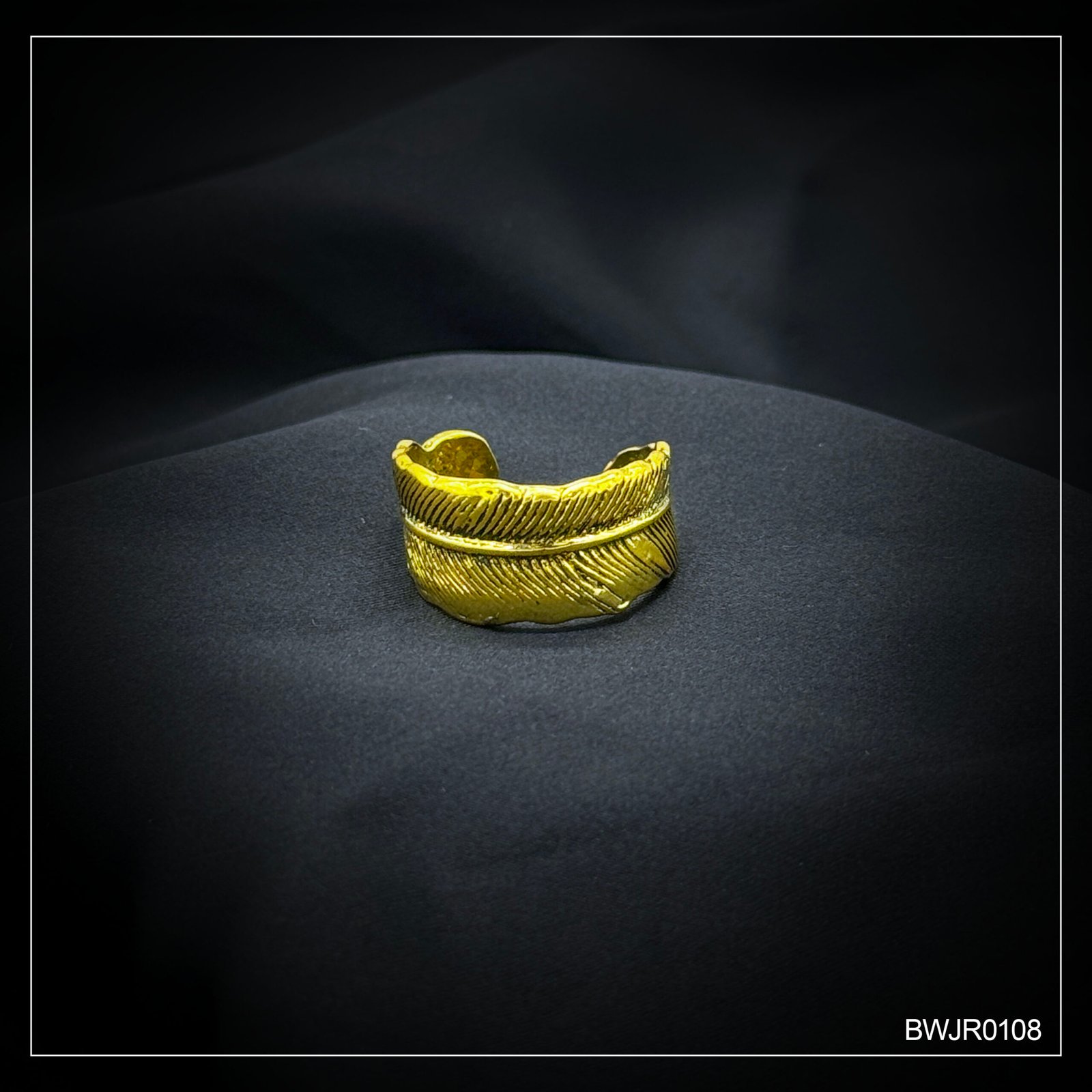 A uniquely designed feather-inspired ring with intricate details. Available in gold and silver plating, this stylish ring adds a touch of elegance and boldness to your look.
