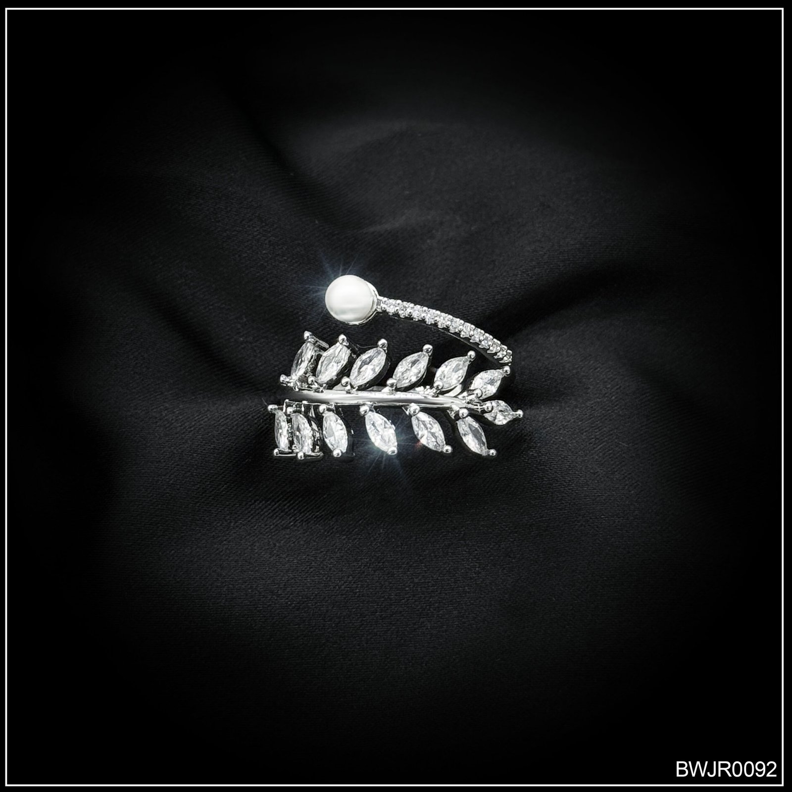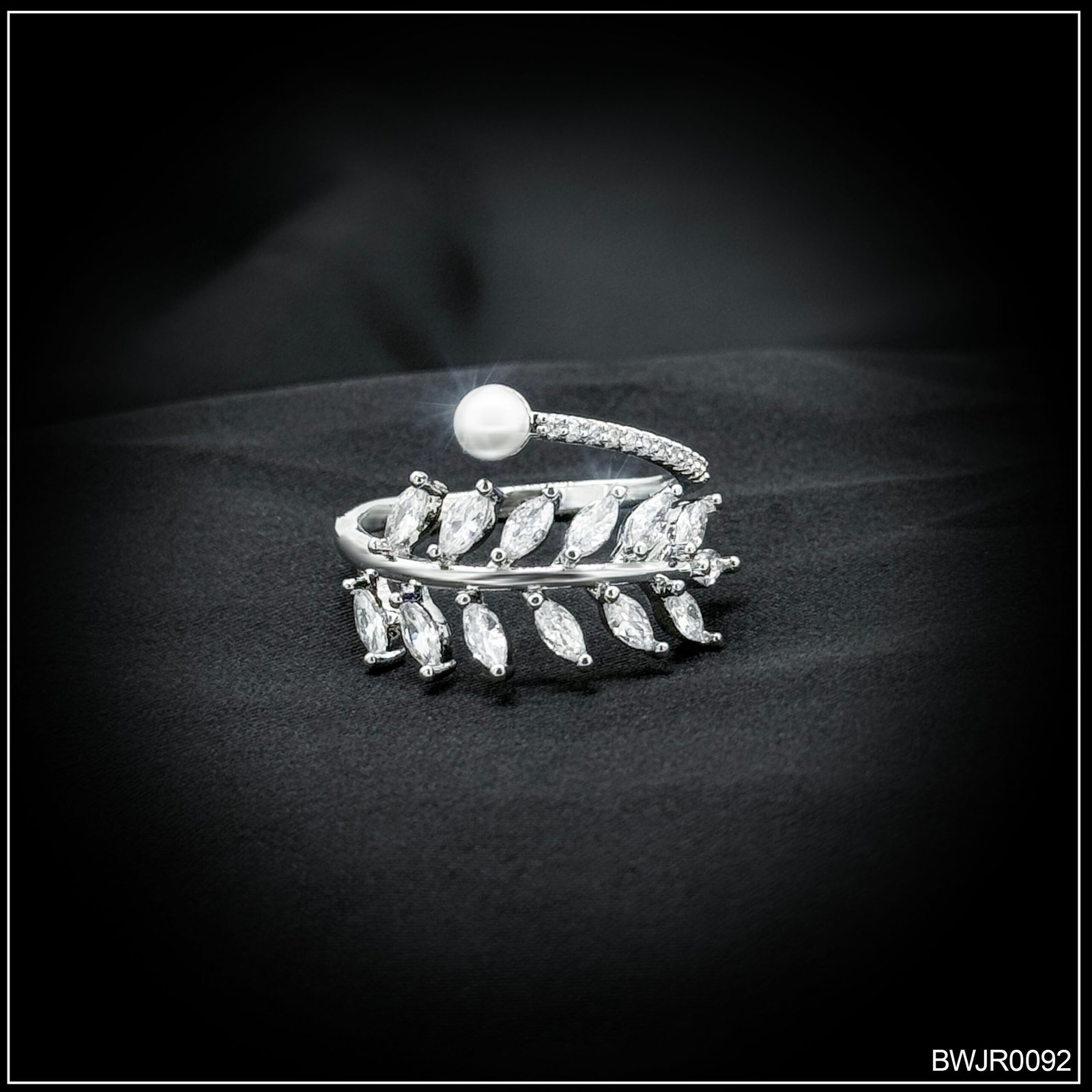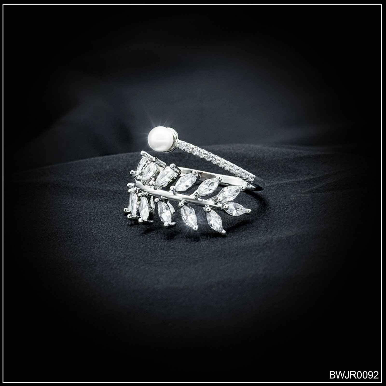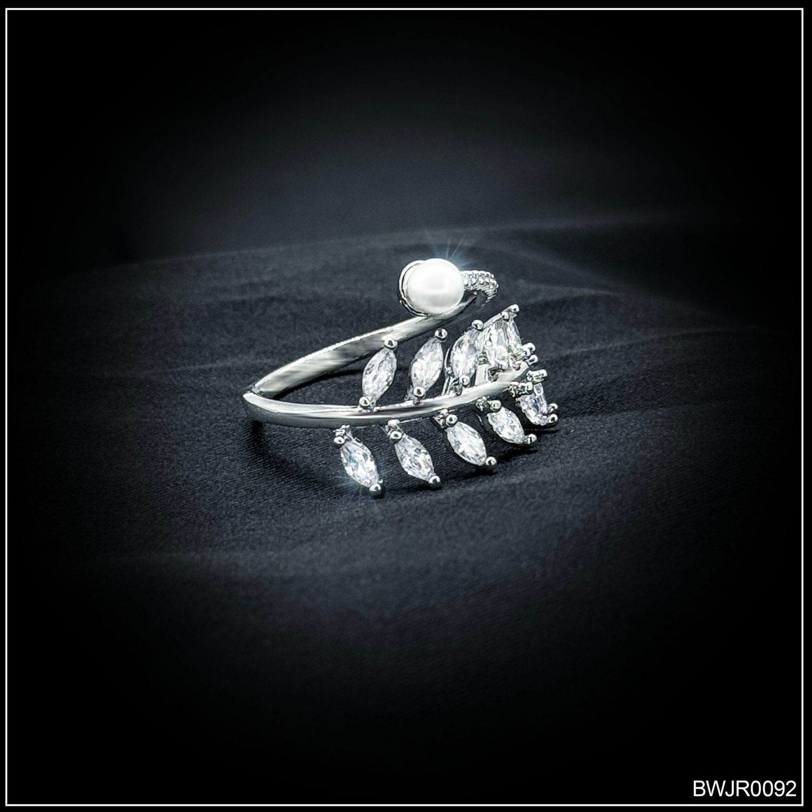 Elegant silver adjustable ring featuring a leaf-inspired design adorned with marquise-cut cubic zirconia stones and topped with a single pearl accent. Perfect for adding sophistication to any outfit.