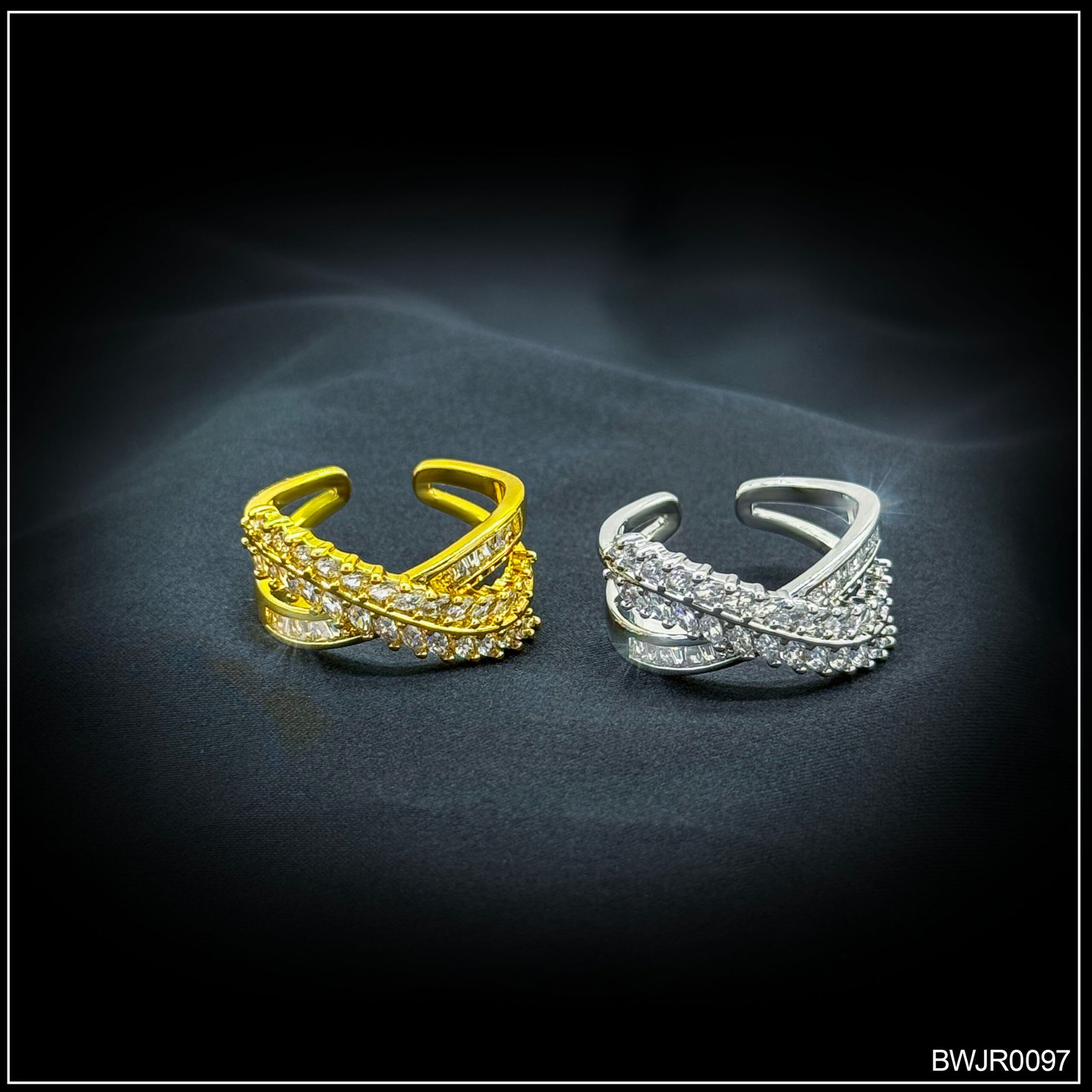 Elegant double-layer adjustable ring featuring intertwined rows of sparkling cubic zirconia stones. Available in luxurious gold and silver finishes, perfect for both casual chic and formal occasions.