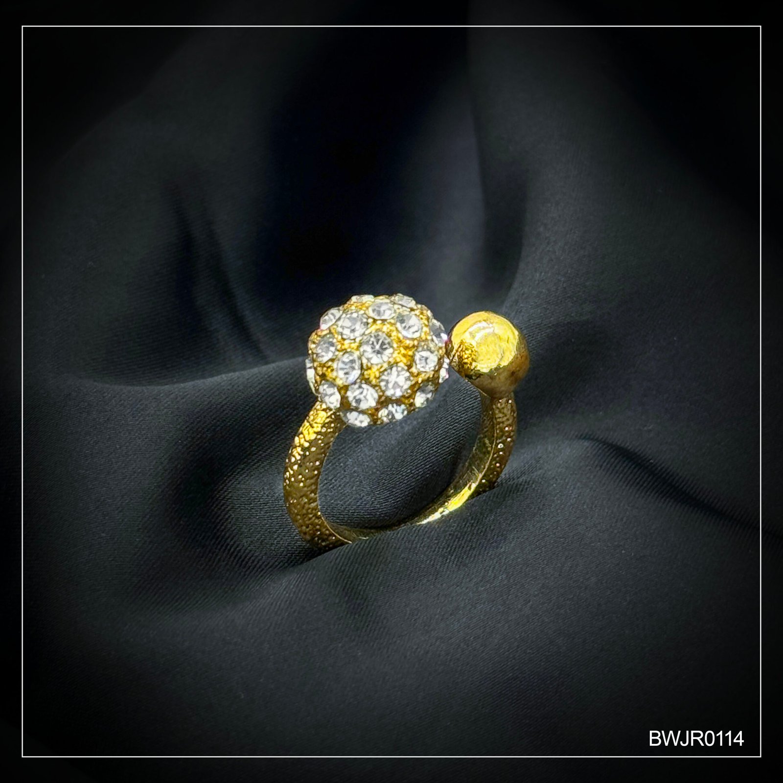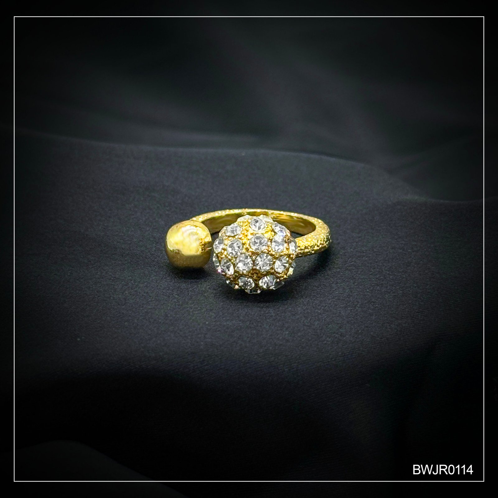 Elegant gold-plated ring featuring a stunning crystal-studded ball design that adds sparkle and sophistication to your look. Perfect for both formal and party wear.