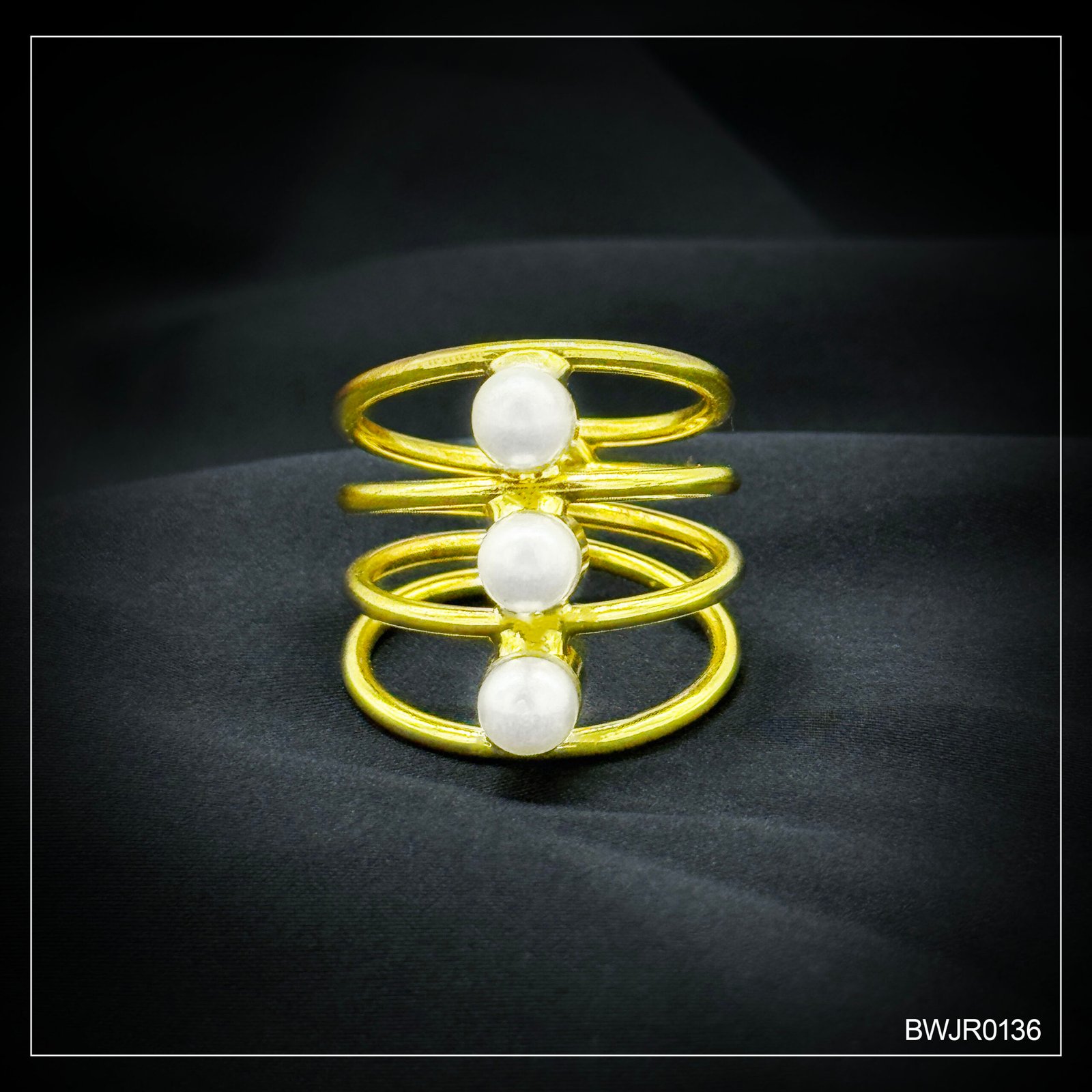 Elegant gold-toned ring featuring three lustrous pearls aligned vertically on an open triple-band design — a perfect blend of sophistication and modern charm.